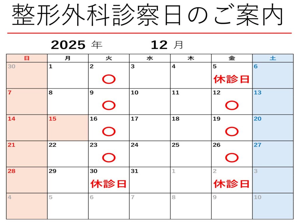 12月5日(金)の整形外科は、仲里先生がお休みの為、休診いたします。